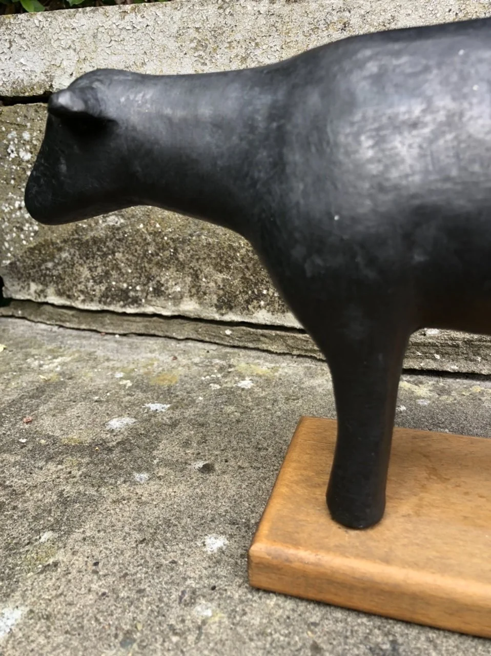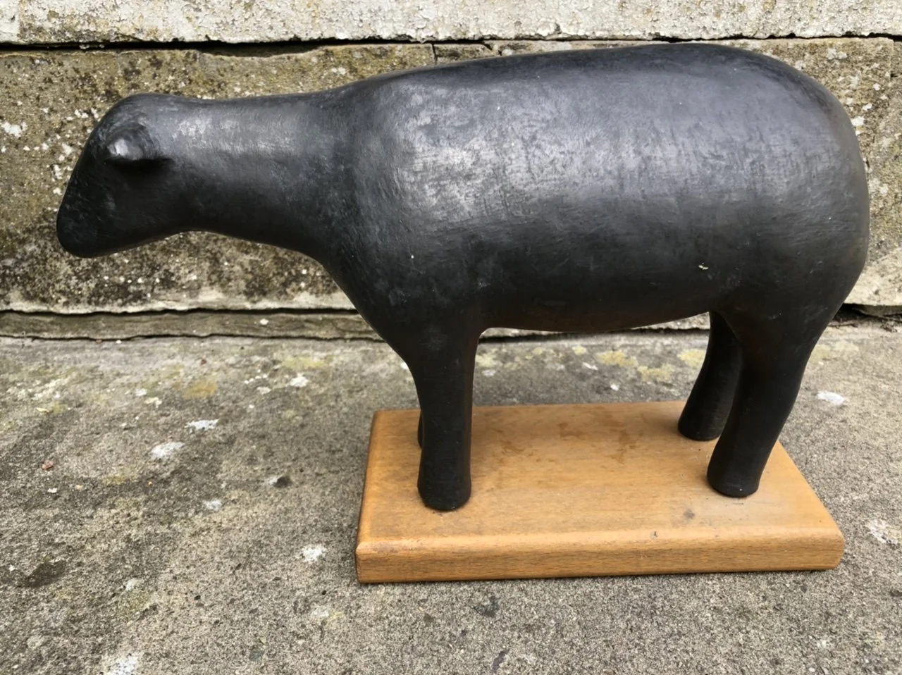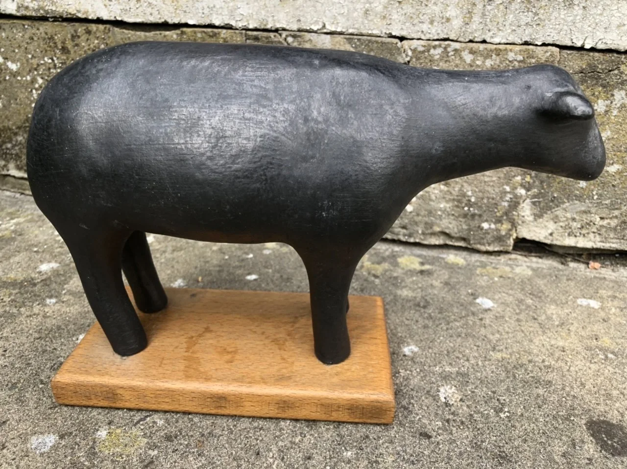 An interesting blackened ceramic sculpture of a sheep, reminiscent of Lalanne. Mounted on a timber plinth.