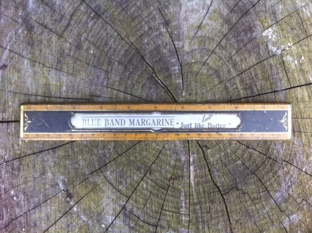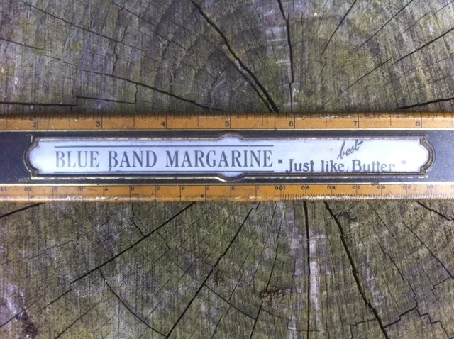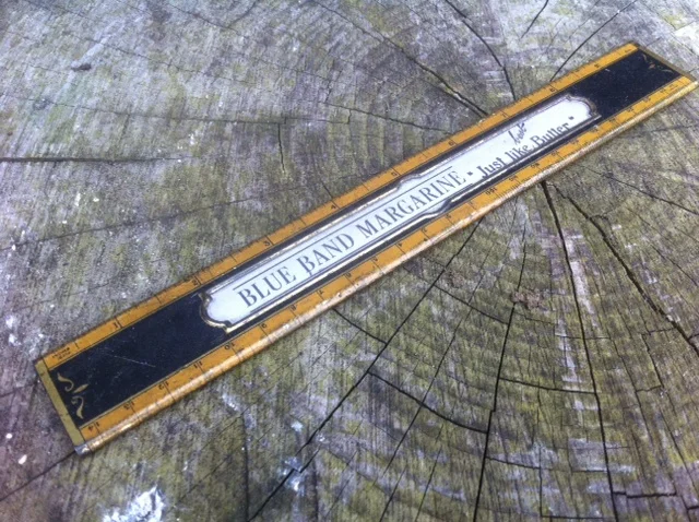 A wooden ruler with brass ends & Blue Band Margarine advertising.