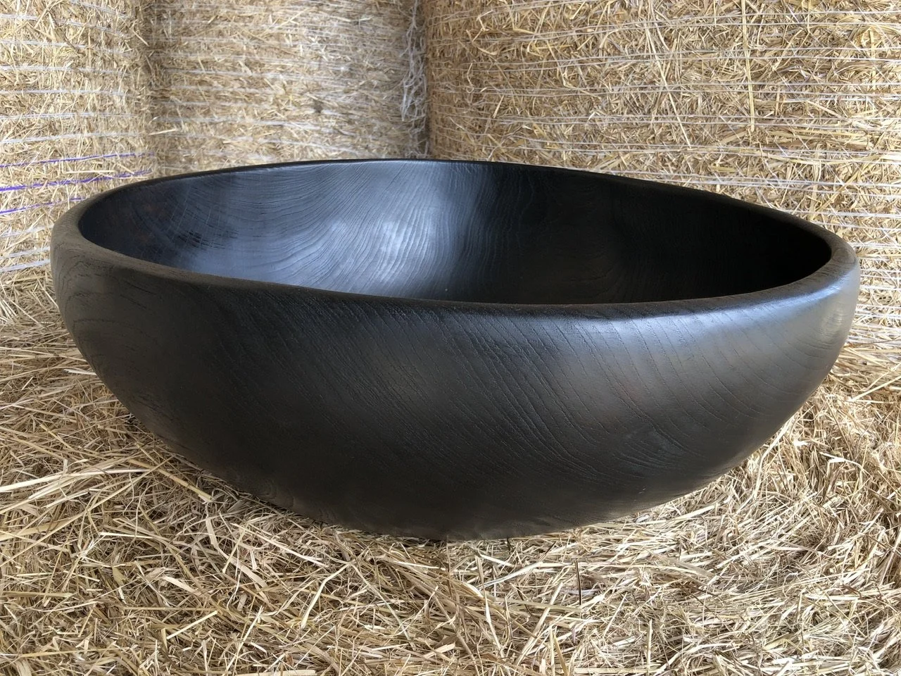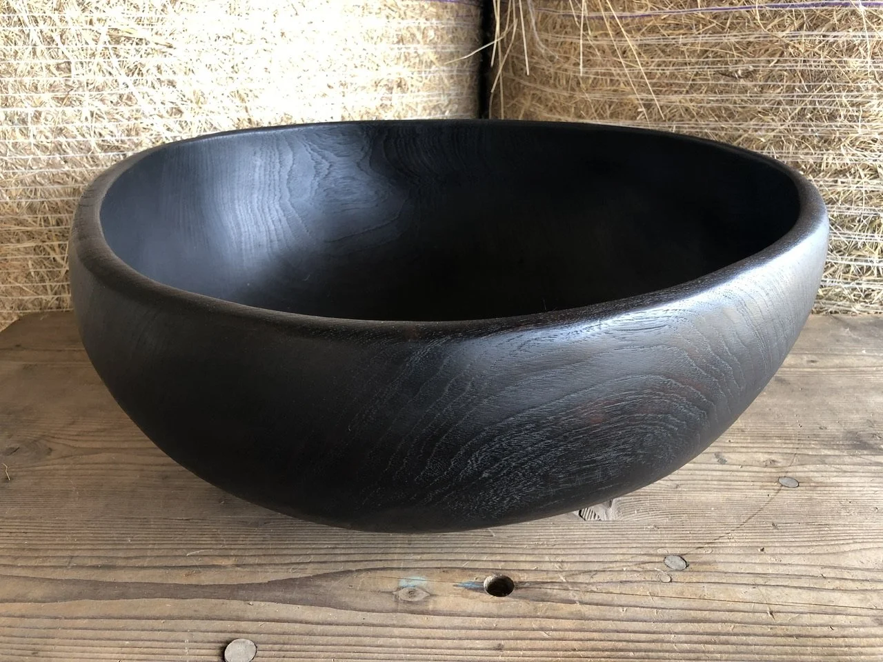 A large asymmetrical wooden bowl that has an oiled scorched charred finish.