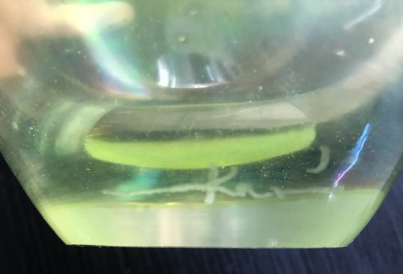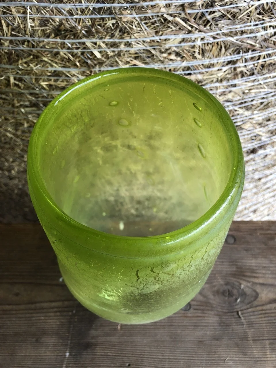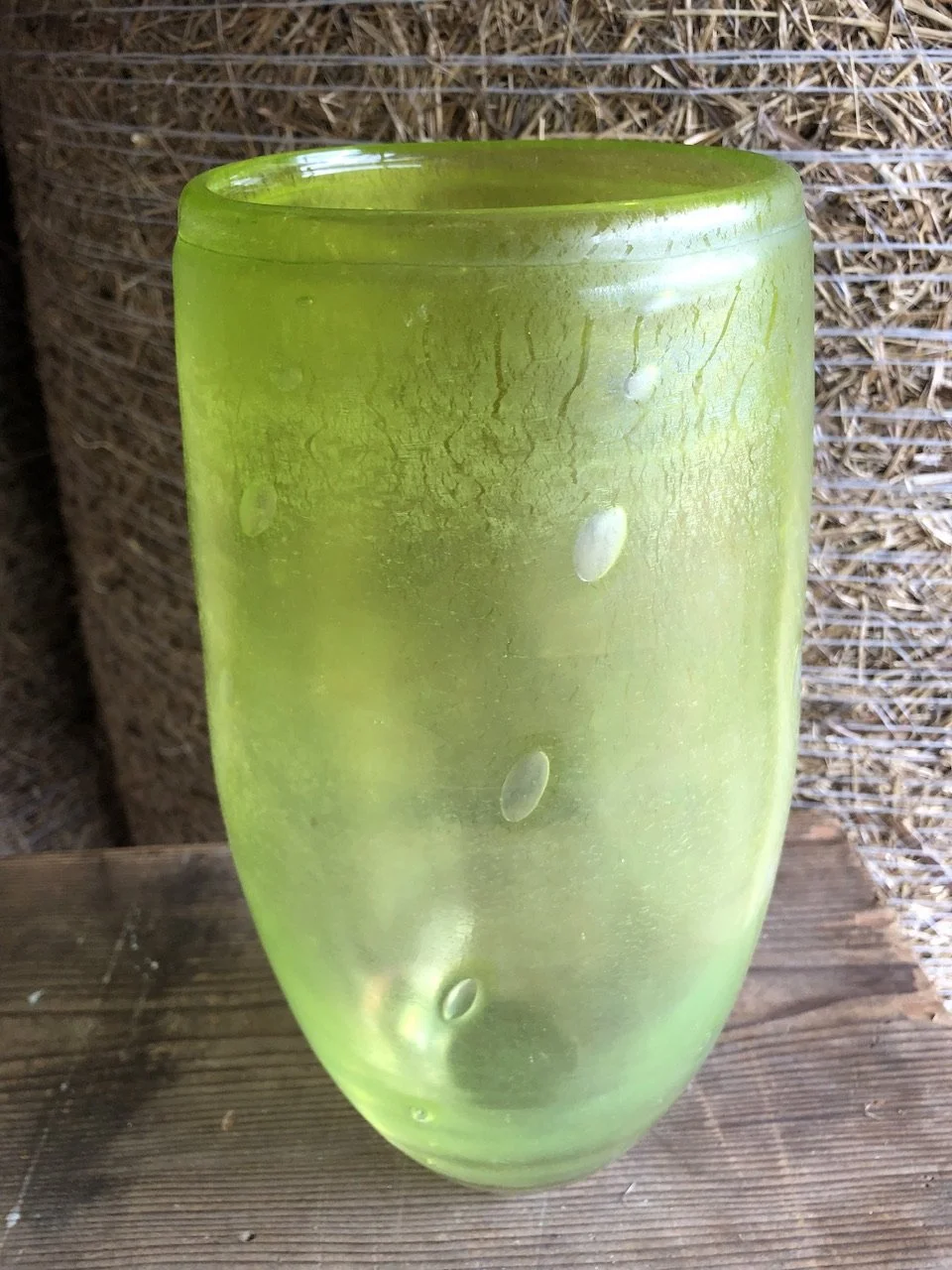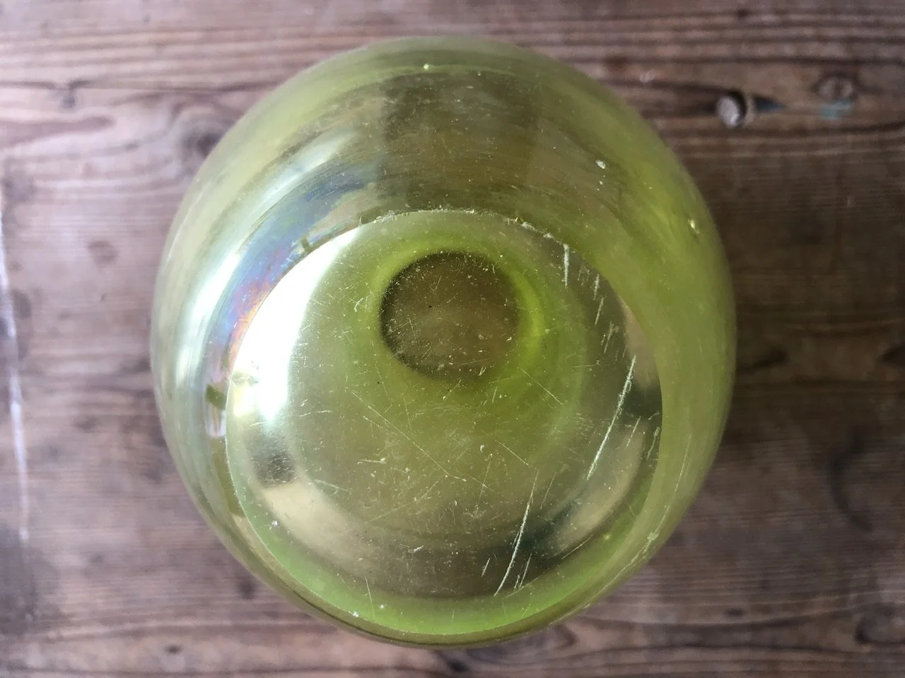 A large hand made yellow glass vase with bubbles & a good pontil to the base. Fully signed to the lower edge.