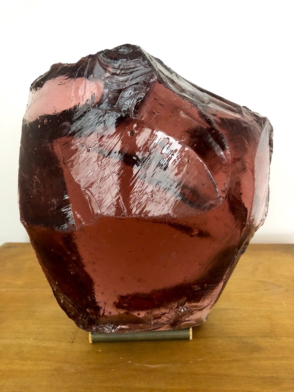 A heavy & sculptural glass sculptural block. With a metal rod support to the base to position it.