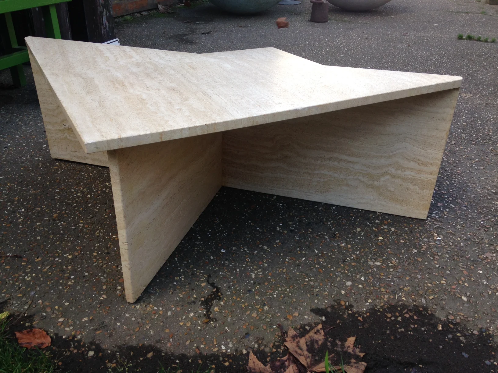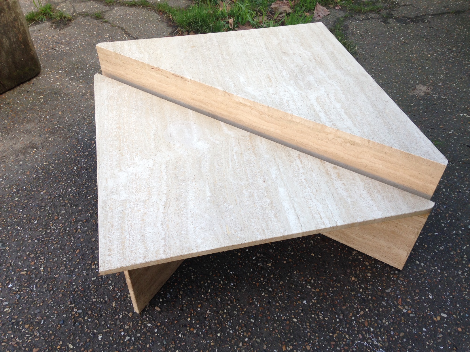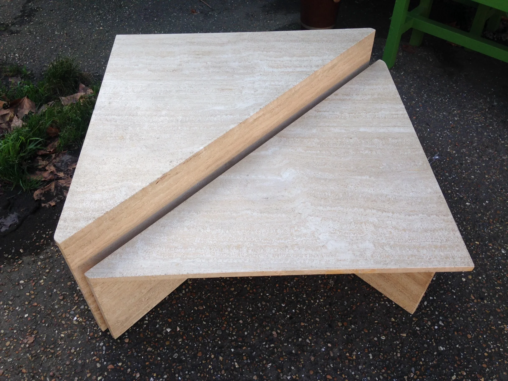 A smart set of two travertine coffee tables. Can also be used separately as two triangular tables.