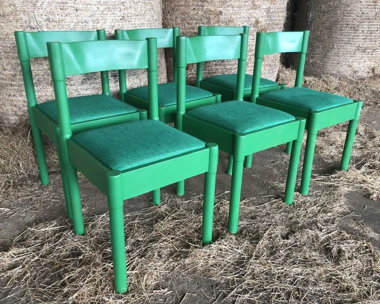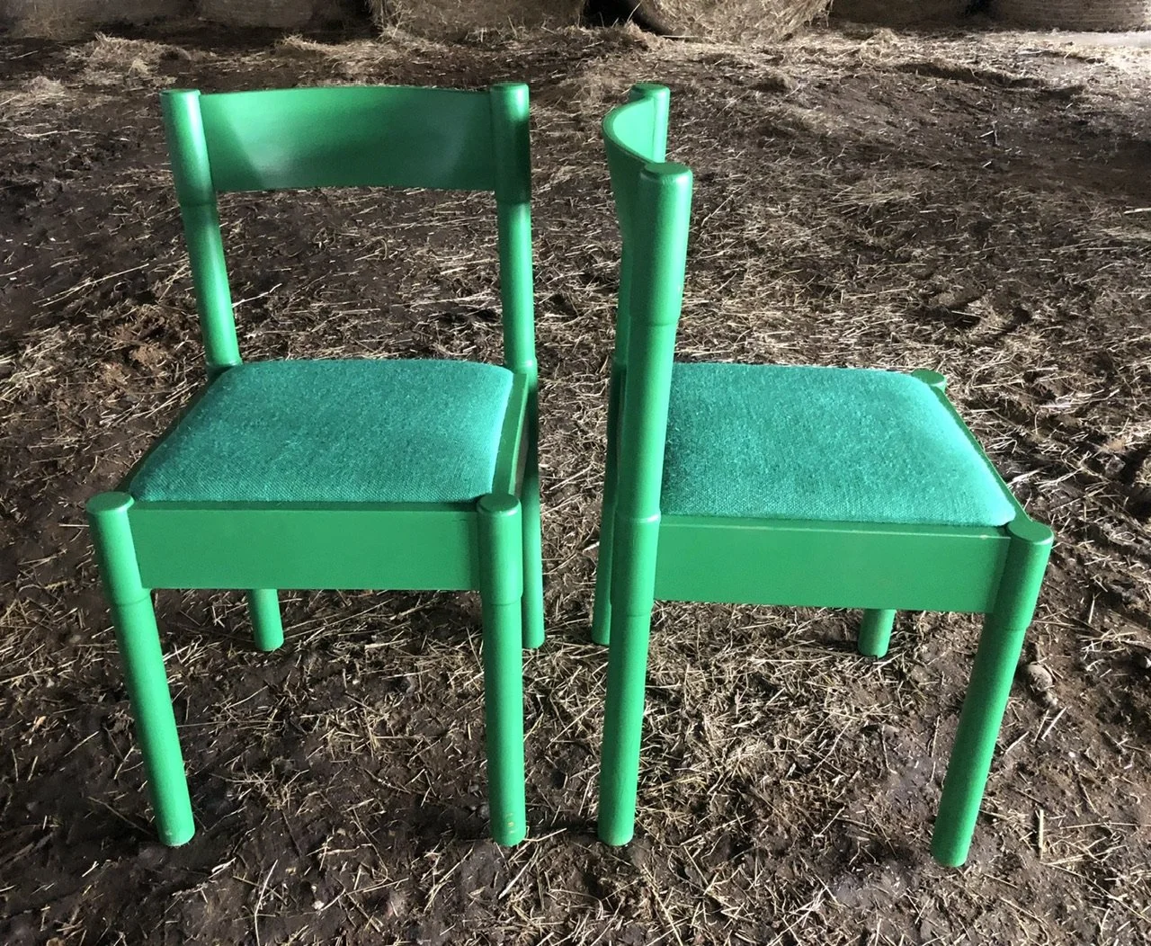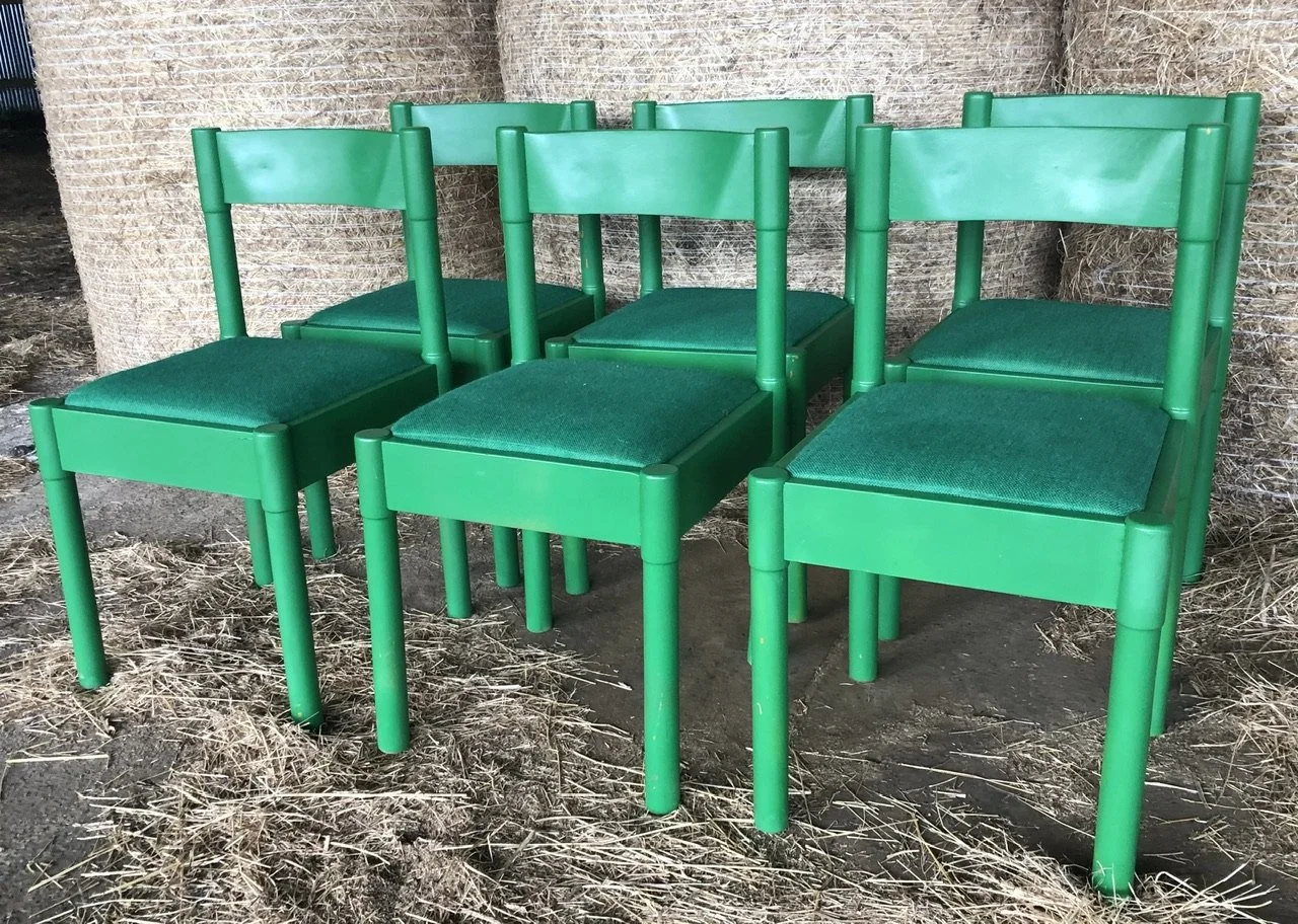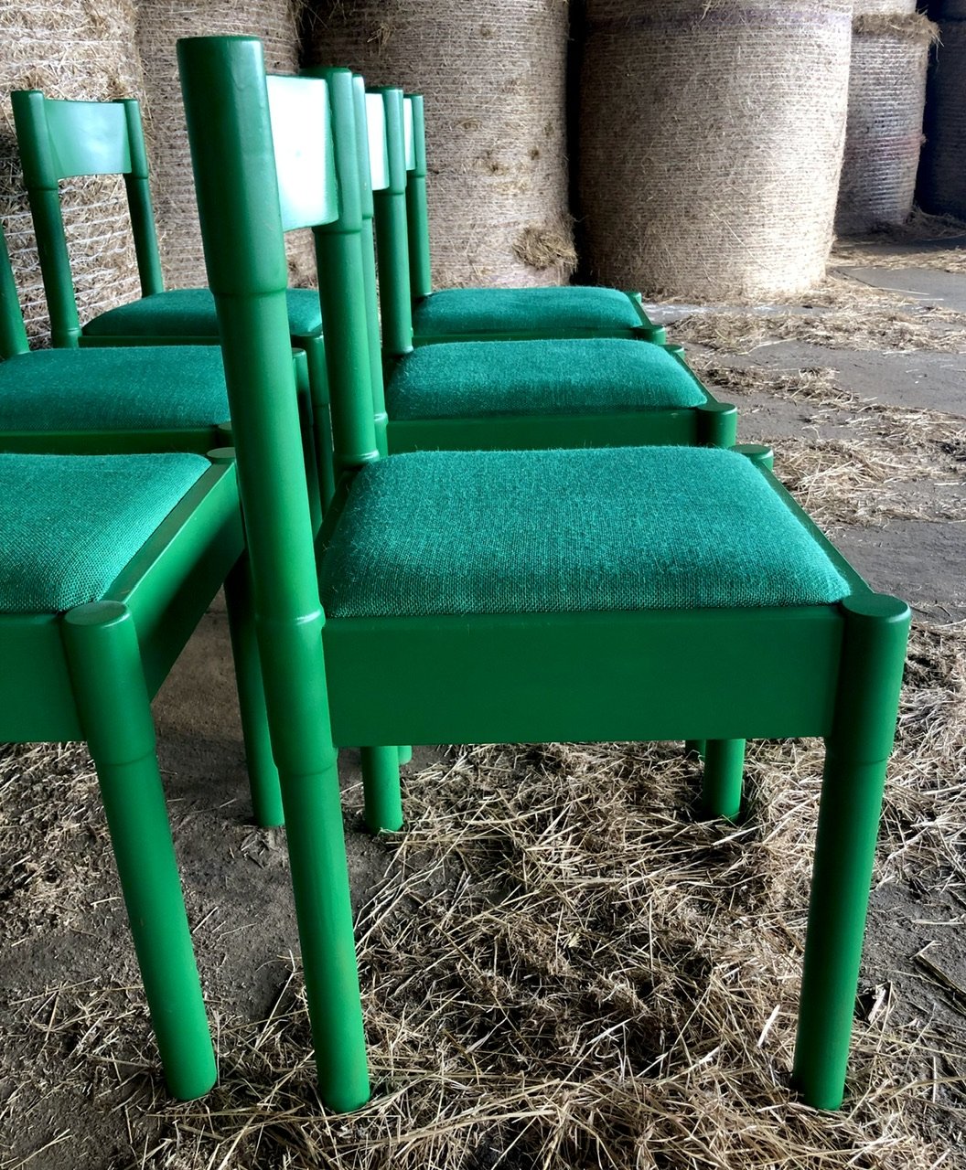 A set of six green painted dining chairs. A green hessian has bee used on the seat pad.
