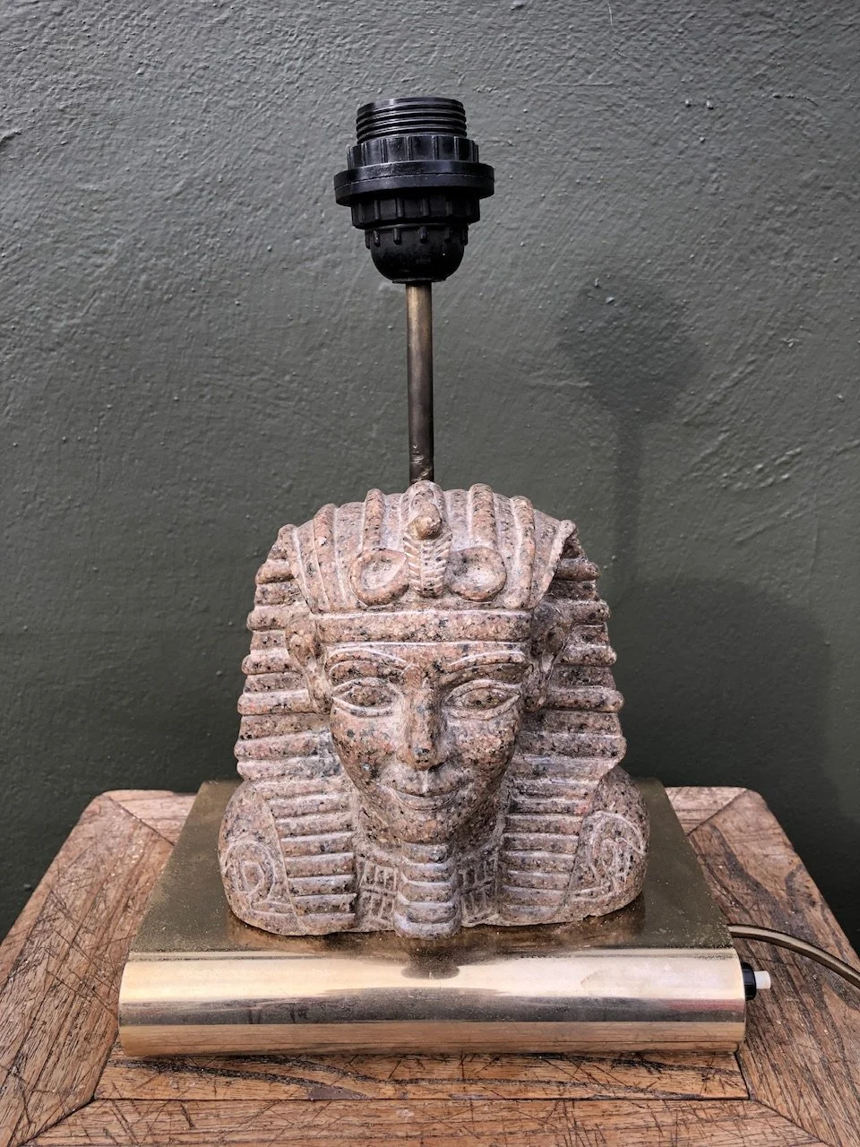 A lamp with a granite Pharaoh & brass details & with a bespoke raffia shade. This lamp has been fully rewired.