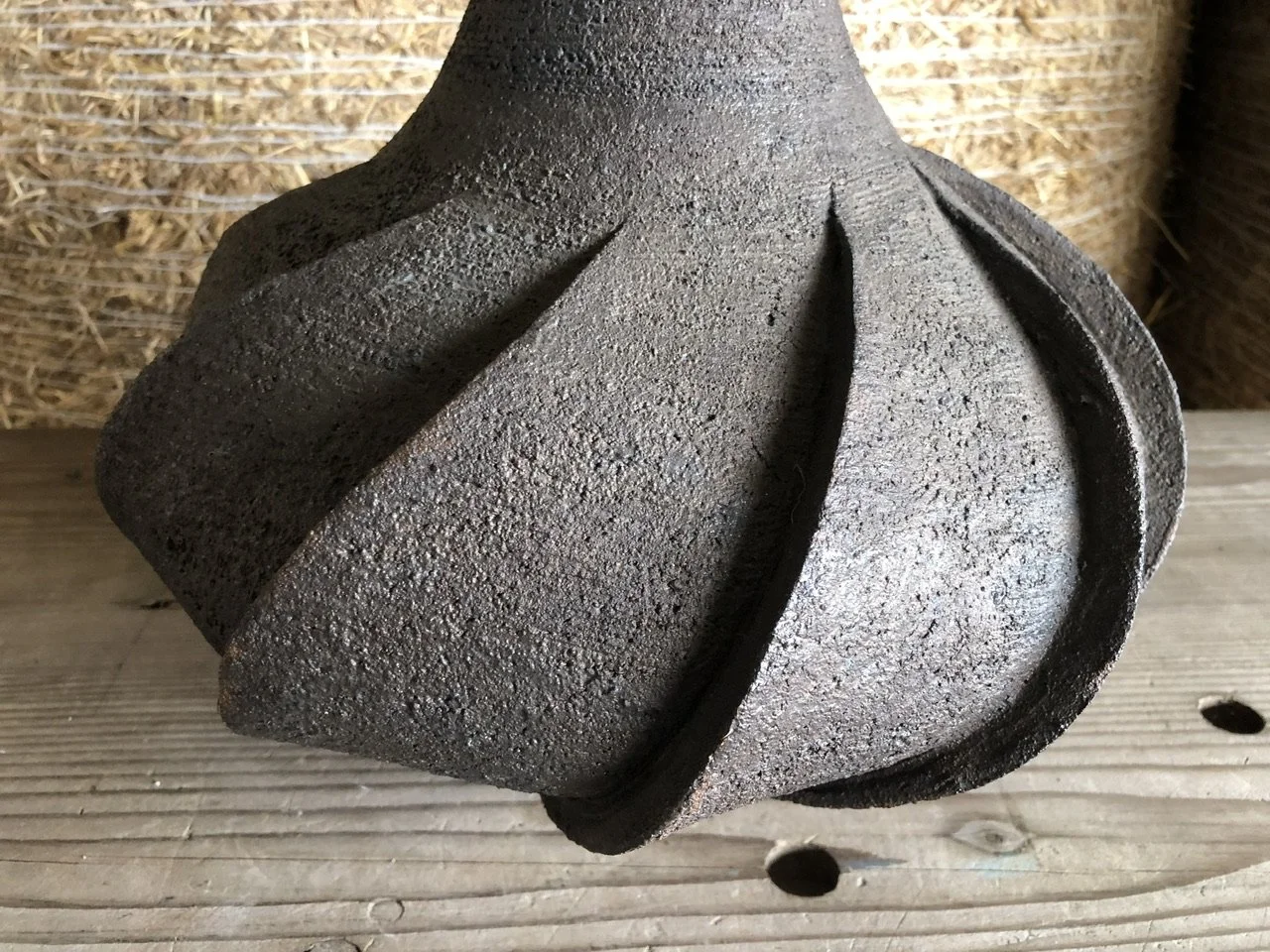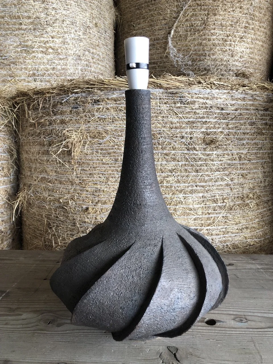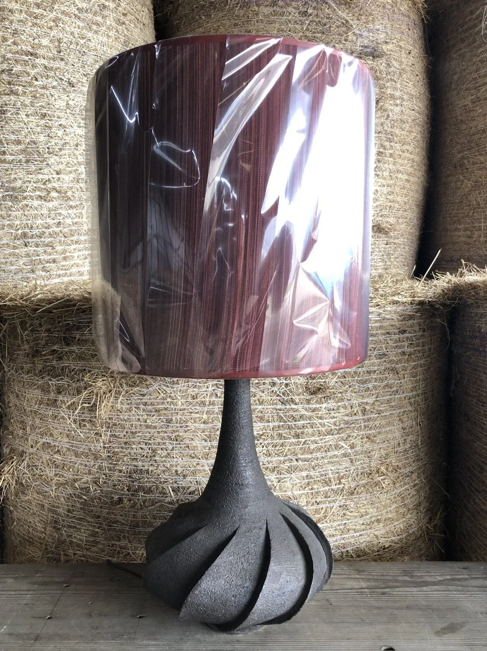 A stylish studio pottery lamp, with a dark red horsehair fabric shade from John Boyd Textiles.