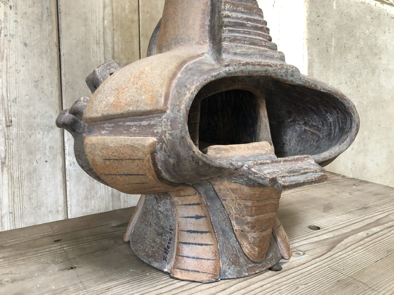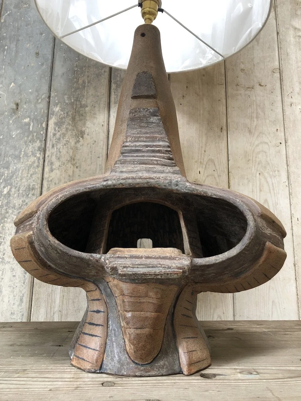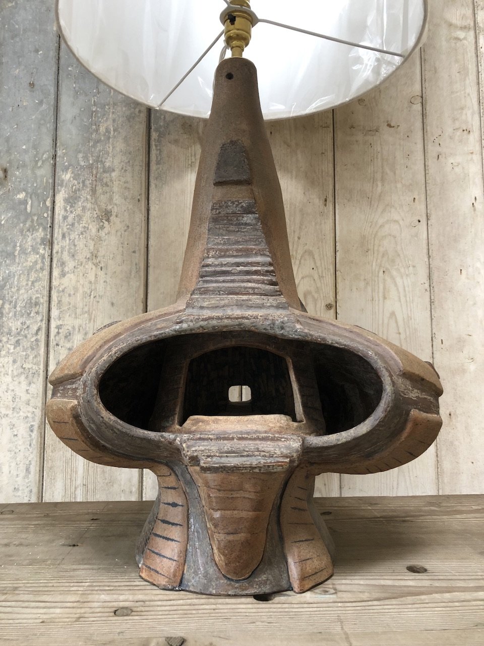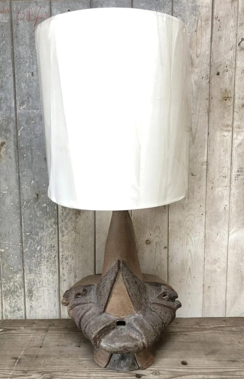 A spectacular sculptural studio pottery lamp, with a new cream fabric shade. This lamp has over scaled proportions, so could be used on the floor also.