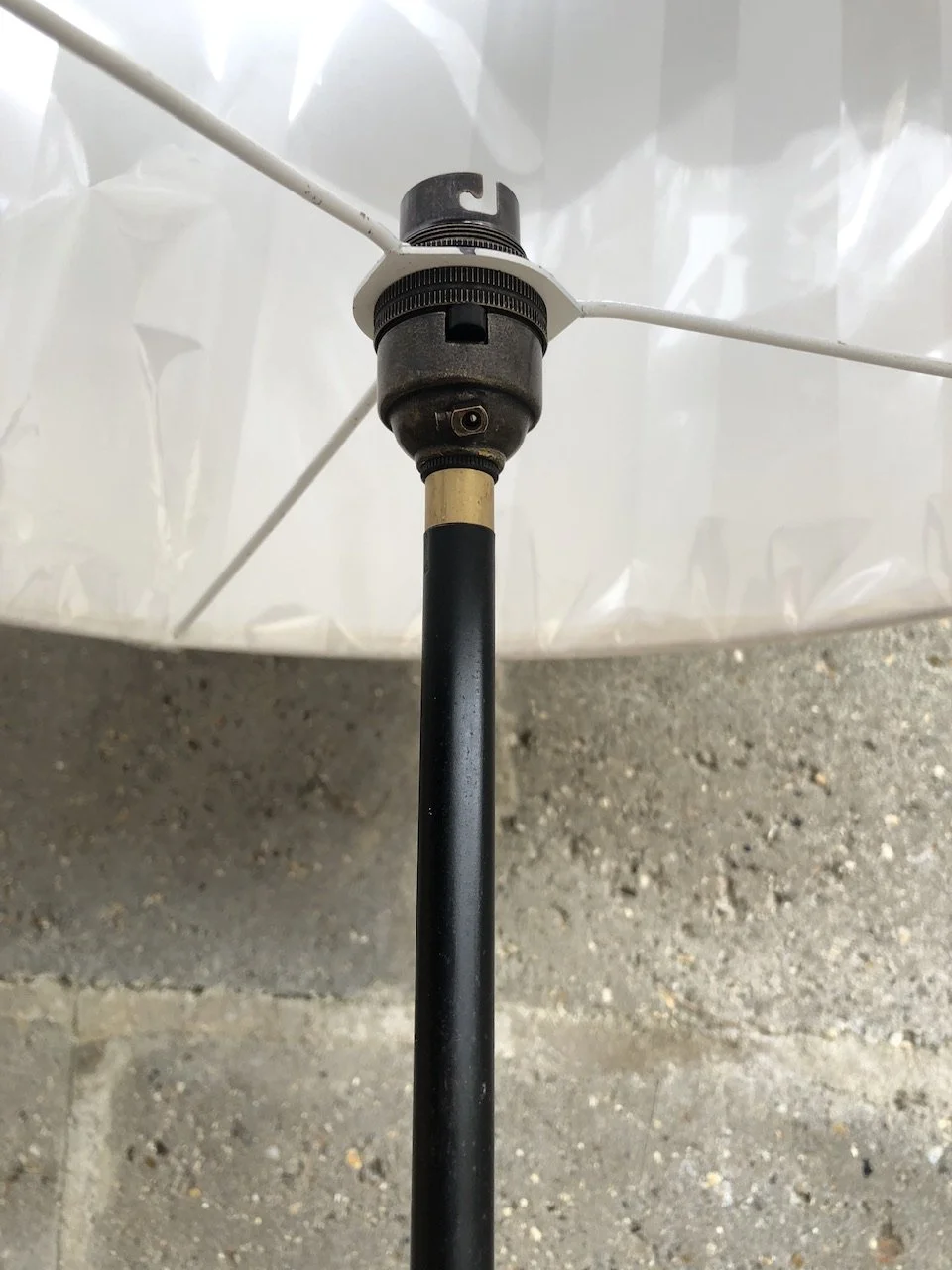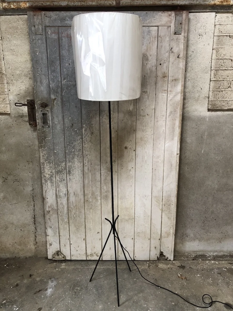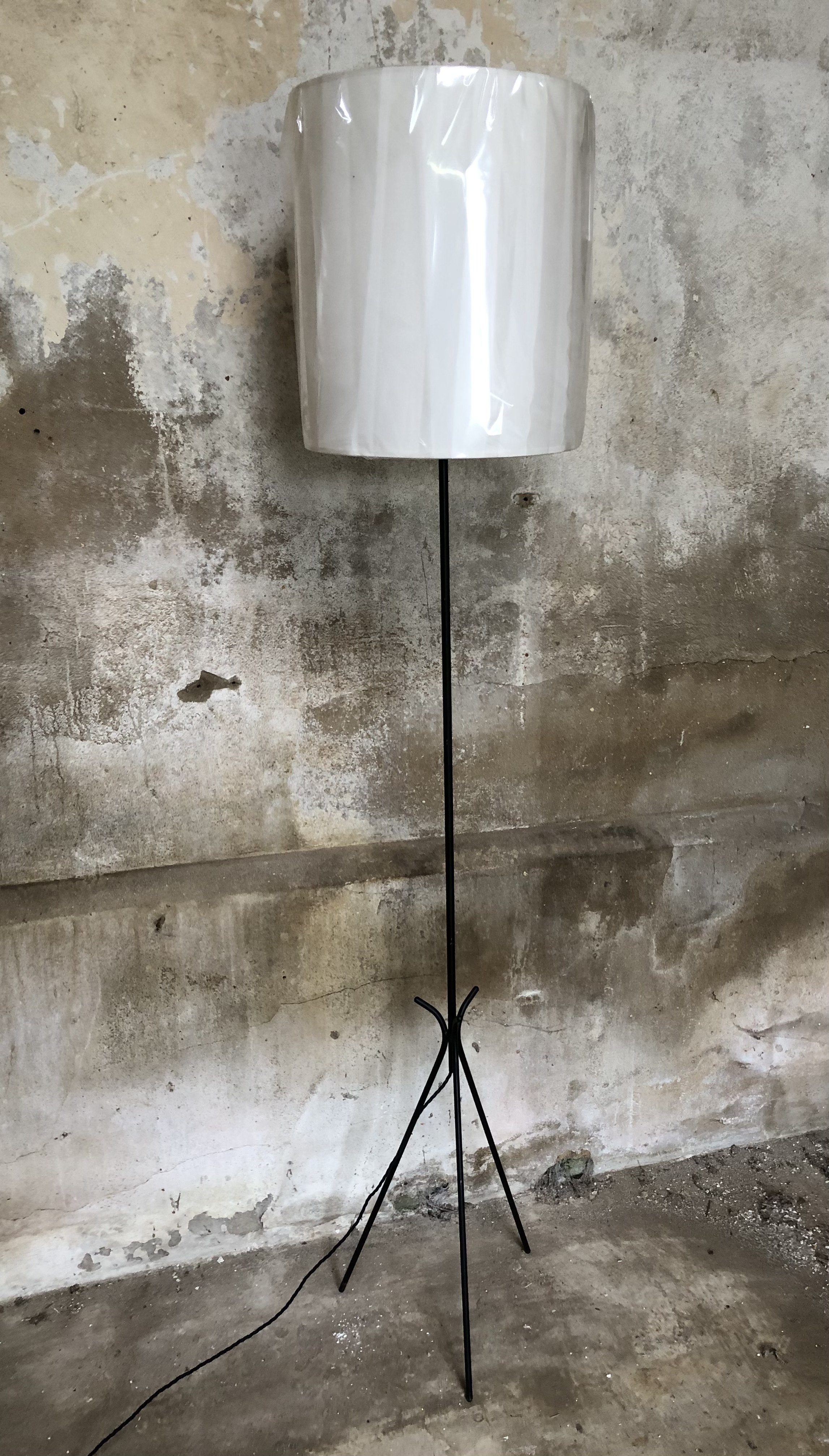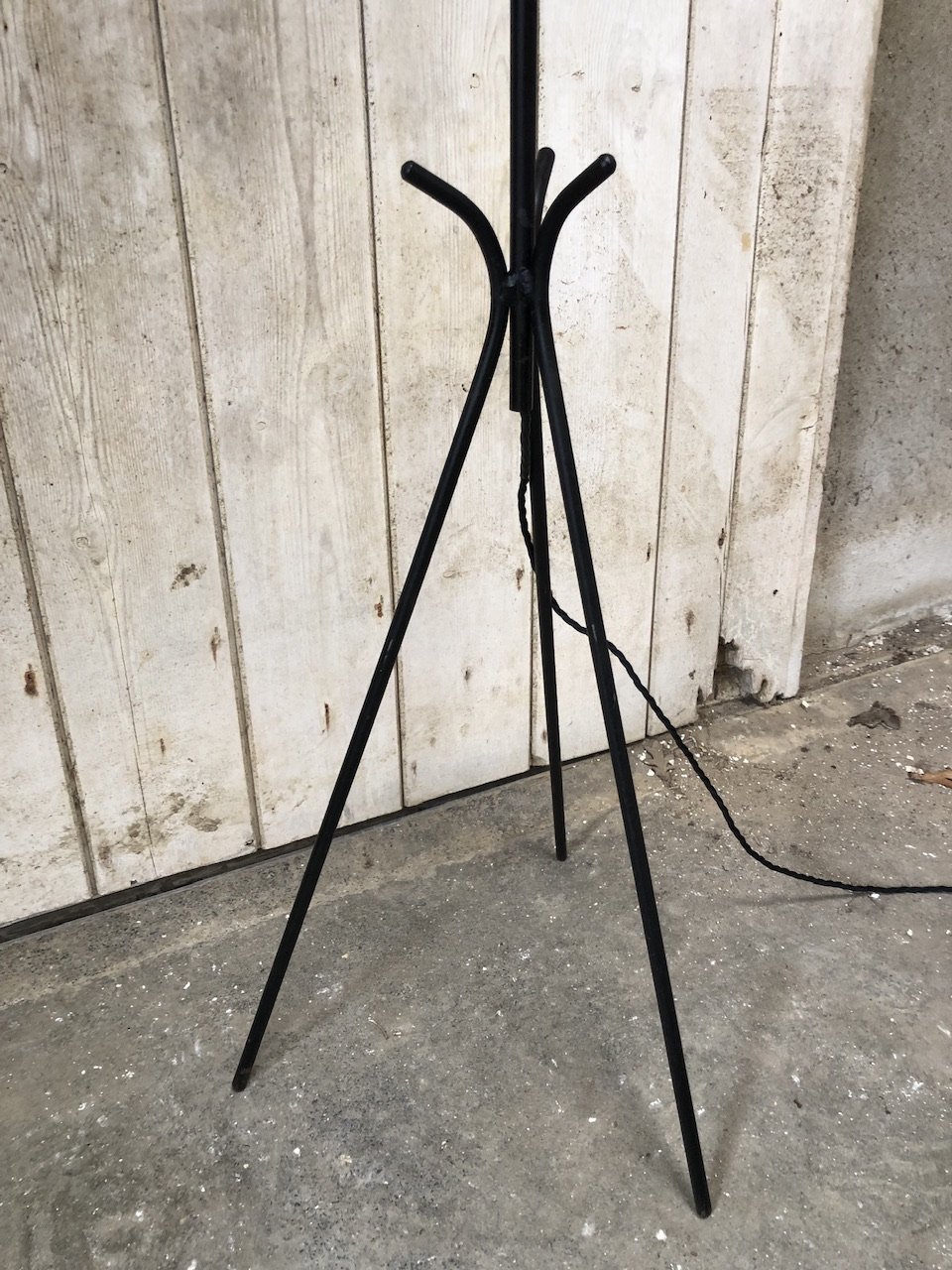 A 1950s floor lamp with a shaped tripod base & a new cream fabric shade. Smart & simple.