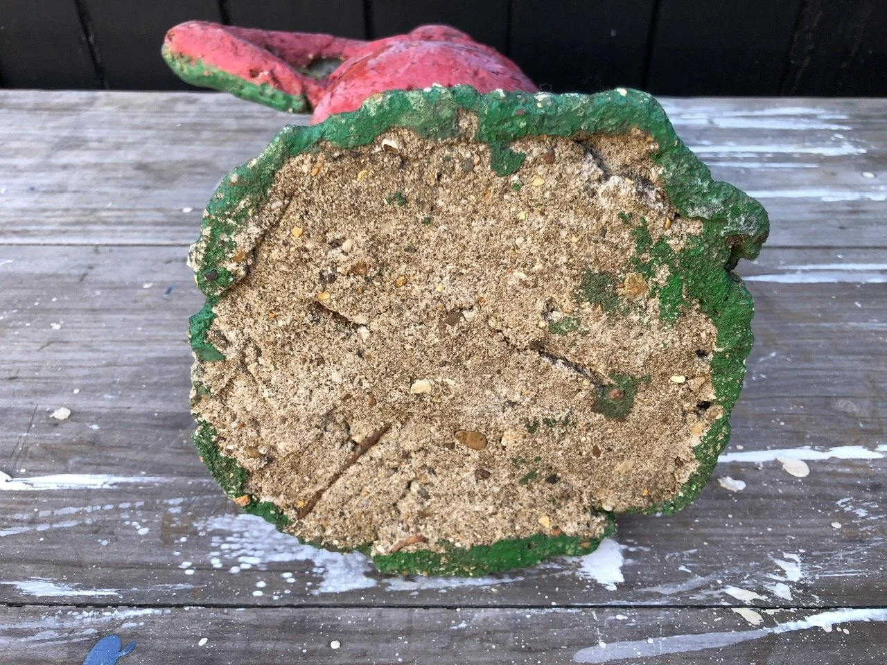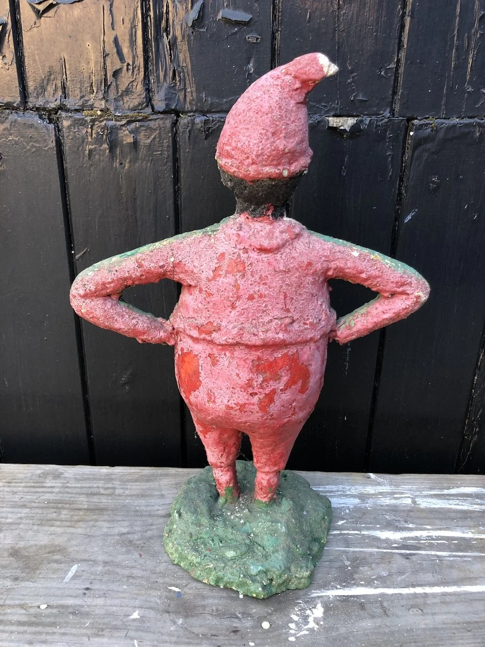 A cast stone garden elf/gnome with a cheeky & defiant pose.